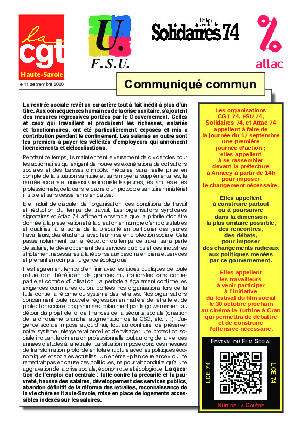 Appel intersyndicale 17 septembre Tweeter Partager Partager 17-Septembre cliquez pour avoir le tract en PDF Imprimer cet article Télécharger cet article 17 septembre 2020
